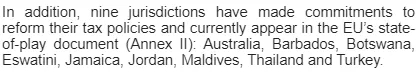 此外,9個(gè)司法管轄區(qū)已作出改革其稅收政策的承諾,已從非合作名單除名,但仍處于考察階段,包括澳大利亞、巴巴多斯、博茨瓦納、斯瓦蒂尼、牙買加、約旦、馬爾代夫、泰國(guó)和土耳其。