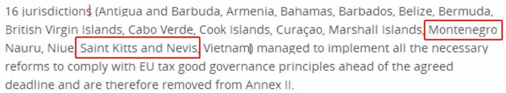 早在2020年2月更新的非合作名單中,就移除了黑山、圣基茨和尼維斯等16個(gè)管轄區(qū),這也意味著,目前黑山、圣盧西亞、圣基茨均在歐盟稅收白名單之中。