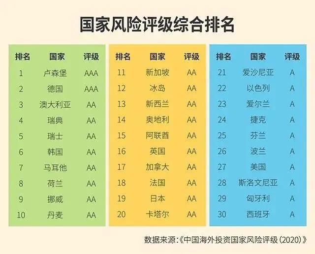 從總的評級結(jié)果來看,發(fā)達國家經(jīng)濟基礎(chǔ)較好,政治風(fēng)險較低,社會彈性較高,償債能力較強,整體投資風(fēng)險明顯低于新興經(jīng)濟體,因此評級結(jié)果普遍高于新興經(jīng)濟體,海外投資風(fēng)險相對較低。