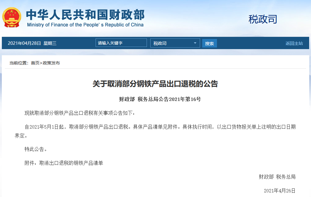 自2021年5月1日起,取消部分鋼鐵產(chǎn)品出口退稅。具體產(chǎn)品清單見(jiàn)附件。具體執(zhí)行時(shí)間,以出口貨物報(bào)關(guān)單上注明的出口日期界定。