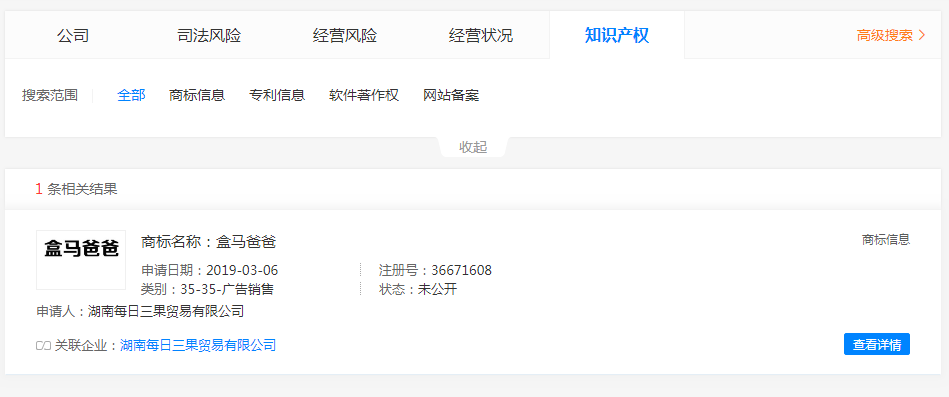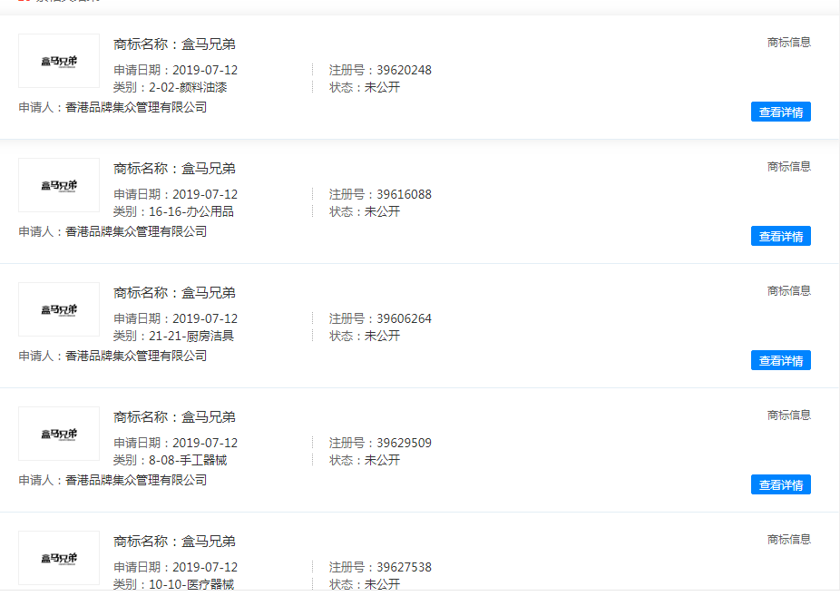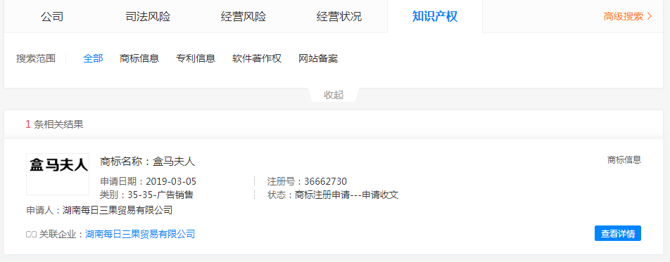 我們通過天眼查發(fā)現(xiàn),“盒馬夫人”、“盒馬爸爸”都是湖南每日三果貿(mào)易有限公司注冊,“盒馬兄弟”商標(biāo)持有人是香港品牌集眾管理有限公司,“盒馬小姐”持有者是哈爾濱市香坊區(qū)盒馬小姐咖喱屋,目前該公司顯示已注銷。