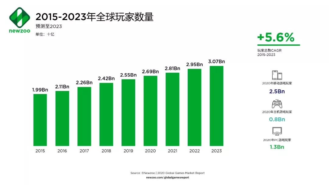 根據(jù)Newzoo最新發(fā)布的《2020年全球游戲市場(chǎng)報(bào)告》顯示,全球游戲市場(chǎng)規(guī)模將達(dá)1593億美元,同比增長(zhǎng)9.3%;全球游戲玩家數(shù)量將持續(xù)增長(zhǎng),到2023年將超過(guò)30億。